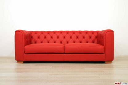 Die Rückenlehne und die Armlehnen sind wie beim klassischen Chesterfield mit Knöpfen abgesteppt, während der Rest des Sofas völlig glatt ist.