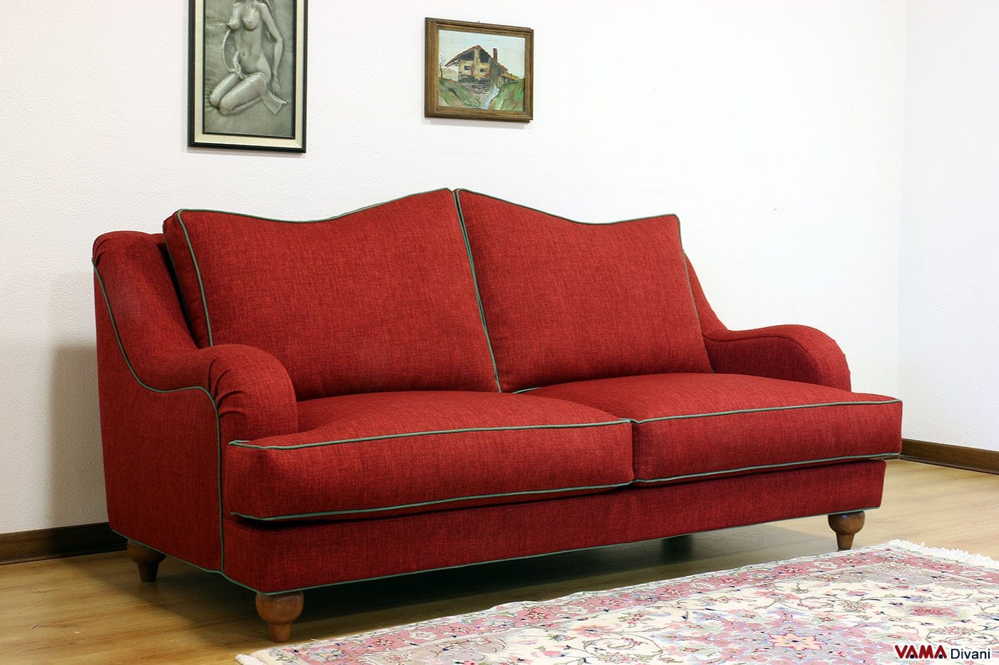 Mit seinen Rundungen und den hohen lackierten Füßen passt dieses Sofa perfekt in klassische und moderne Wohnzimmer. Die Polsterung der Sitze und Rückenlehnen besteht aus Schaumstoff und kann auf Wunsch durch Gänsedaunen und Rollen ersetzt werden.